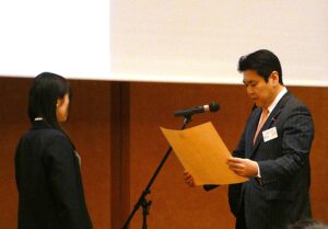松本文科大臣から文部科学大臣賞を授与される綿野さん