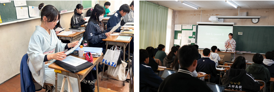 江戸時代から残る「古城の門」がシンボルの長野県上田高等学校では、授業にグローバルスタディという探究活動が設けられている。今回、同校2年の宮本さんは、洋服の大量廃棄という社会課題を背景に、ファッションの選択肢として着物がどう役割を果たすのかをテーマに設定した。このテーマに対して、生徒・教員8人が、1月13日〜16日の4日間、自分たちで着付けして着物姿で学校生活を過ごし、どのような変化や問題点が見つかるのか調査を行った。