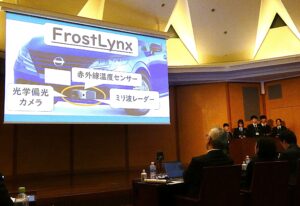 そこで「Potatoman」はレンタカーに新たなセンサーを搭載することを提案。新たに考えたセンサーでは「赤外線温度センサー」「ミリ波レーダー」「光学偏光カメラ」の3つを用いることでブラックアイスバーンに対応。光学偏光カメラでブラックアイスバーンを直接に検知。赤外線温度センサーとミリ波レーダーは視界不良時や泥はね状態でもブラックアイスバーンを検知できる。晴天時や昼間には光学偏光カメラをオンにして、悪天候時や夜間には赤外線温度センサーとミリ波レーダーをオンにする。