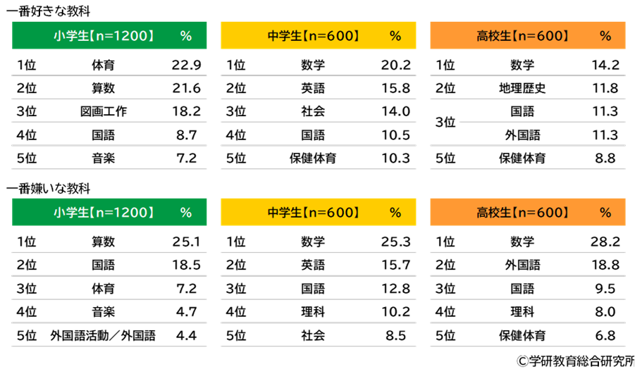 他方、一番嫌いな教科をきいたところ、小学生では1位「算数」、2位「国語」、3位「体育」、中学生では1位「数学」、2位「英語」、3位「国語」、高校生では1位「数学」、2位「外国語」、3位「国語」だった。