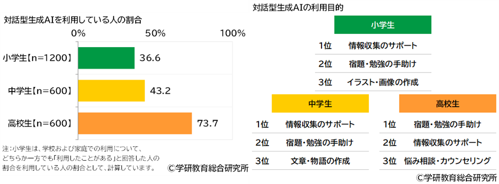 利用目的についてみると、小学生と中学生では1位「情報収集のサポート」、2位「宿題・勉強の手助け」、高校生では1位「宿題・勉強の手助け」、2位「情報収集のサポート」と、TOP2は校種にかかわらず「情報収集のサポート」「宿題・勉強の手助け」だった。また、小学生では「イラスト・画像の作成」、中学生では「文章・物語の作成」、高校生では「悩み相談・カウンセリング」が3位となった。