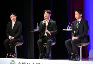 第二部で登壇した学生たち。写真左から、立教大学・日高愛梨さん 、国際基督教大学・福井凱大氏さん、慶応義塾大学・小野日向汰さん