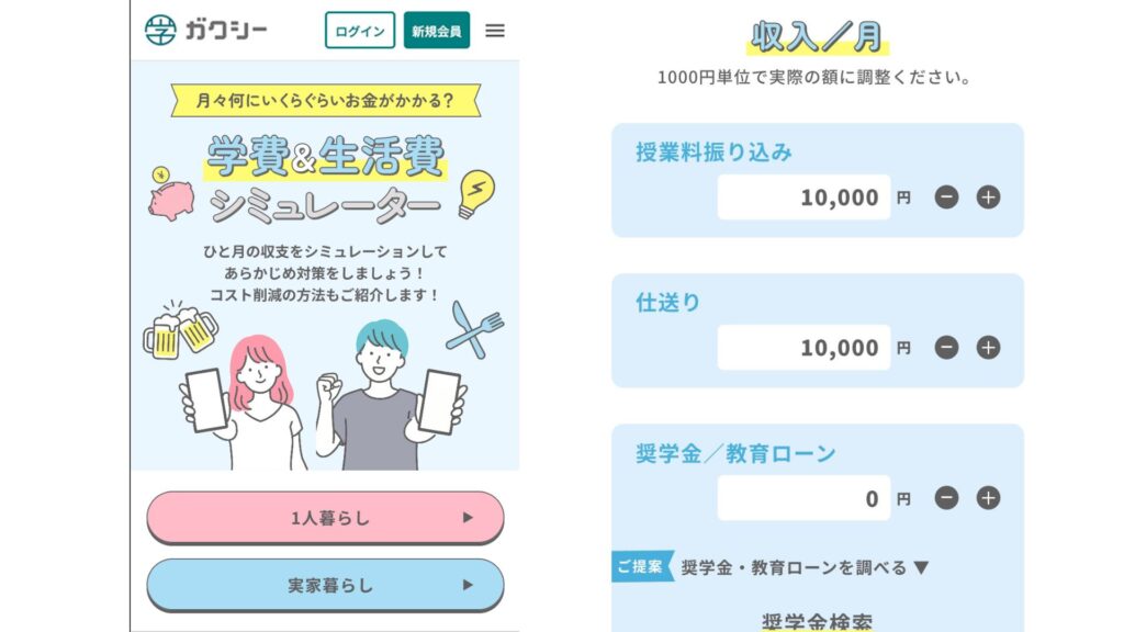 進学に必要な費用や奨学金の必要額など大学進学にかかる費用を簡単に試算できる。