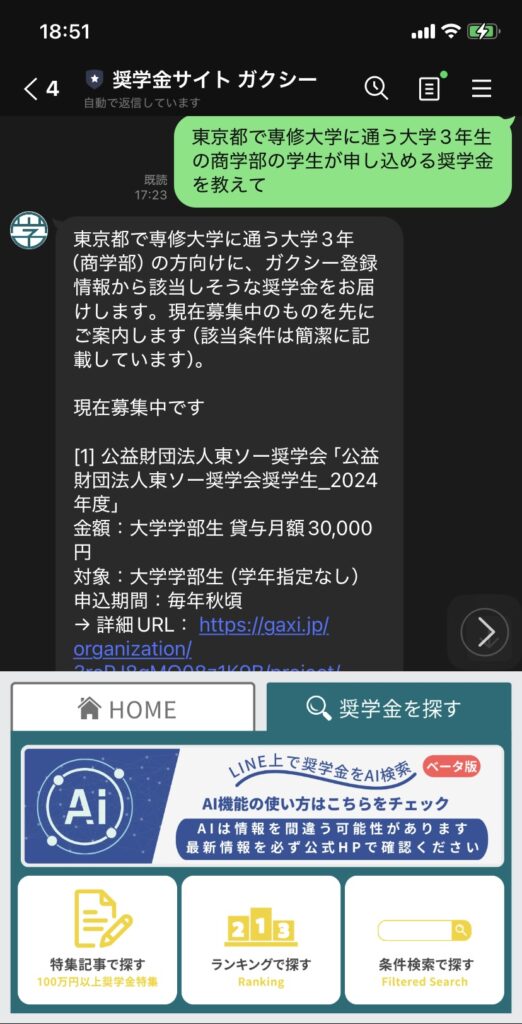「地方国立大学の1年生で、福岡出身です。給付型奨学金ありますか?」などようにLINEで質問を送ると、約3万件の奨学金データベースからAIが条件に合う奨学金候補を提案する。