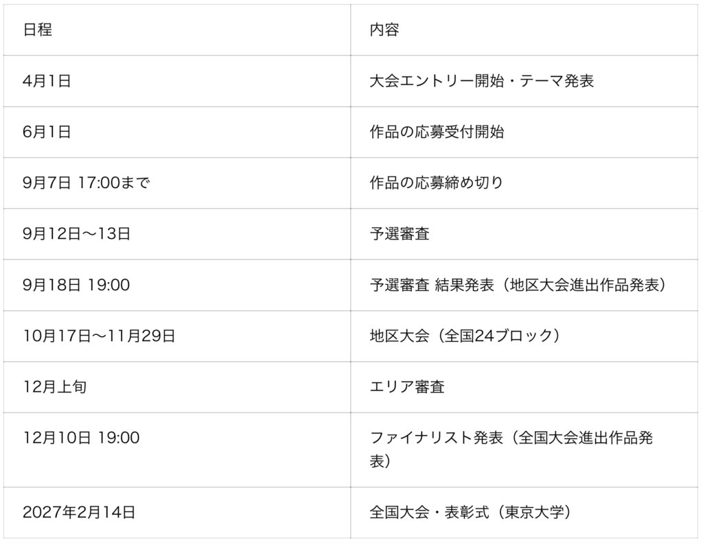 今年度は部門制を廃止し、1人から応募できる。作品の応募締め切りは、9月7日。予選審査・地区大会・エリア審査を経て、2027年2月14日「東京大学」にて全国大会・表彰式を開催する。