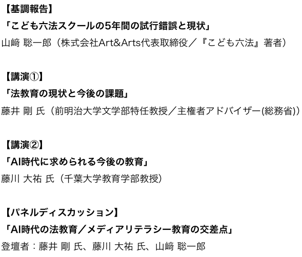基調報告と、主権者教育アドバイザー藤井剛氏(前明治大学特任教授)、メディアリテラシー教育の第一人者・藤川大祐氏(千葉大学教授)による講演・パネルディスカッションを通じ、AI時代における法教育とメディアリテラシー教育の交点を議論する。