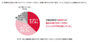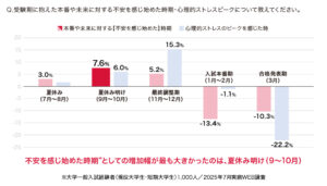 今回の調査によると、夏休み明け(9月~10月)における受験ストレスについて、「強く感じた」「やや感じていた」と回答した受験経験者は、全体の約8割(79.6%)に上る。また、試験本番や将来に対する不安を感じ始める時期についても、夏休みから秋にかけて年間で最も大きな増加幅(+7.6ポイント)となる傾向が見られた。ストレスのピークにおいては最終調整期(11~12月)に最も増加(+15.3ポイント)する傾向も見られ、受験ストレスにおいて9月から10月が大きな境目になっていることが分かる。