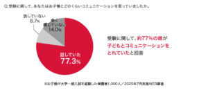 家族とのコミュニケーションに関する質問では、受験経験者の約7割が家族からのサポートに「ありがたみを感じている」と回答。保護者側も受験期における子供とのコミュニケーションについて、77.3%が「話していた」と回答。