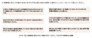 こうした調査結果から、夏に頑張った分、自分への期待がプレッシャーに変わり始めたり、部活動を引退して夏から本格的に受験勉強を始めたものの、先の見えない状況に不安を感じたりと、9月を境目に受験生の心理的負担が高まる傾向にある。さらに、自身の学習の進捗や成績への不満に加え、志望校選びなど進路に関する悩みも重なり、不安やストレスが複合的に高まりやすいタイミングであることが分かる。