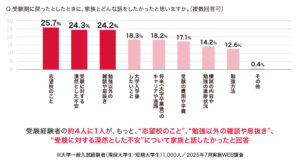 一方、約4人に1人の受験経験者は、「志望校のこと(25.7%)」「勉強以外の雑談や息抜き(24.7%)」「漠然とした不安(24.2%)」などについて、「もっと家族と話したかった」と回答しており、受験期の家族内コミュニケーションに認識のズレが垣間見られた。