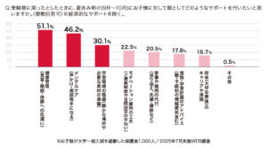 健康面で不調を感じた時期があるかという質問では、冬前(10月まで)と回答する割合が31.7%と約3人に1人が体の不調を経験。“つらいのは一般受験直前の冬”という一般的なイメージとは異なり、秋までの段階で体の不調を感じ始める人も一定数いることが明らかになった。保護者側も夏休み明けに子供にしてあげたいサポートとして、「学習環境の整備(30.1%)」、「メンタルケア(46.2%)」を上回り、「健康管理(51.1%)」が一番多い回答となった。メンタルケアだけでなく健康管理も、早い時期から始めることが重要であり、睡眠や食生活の改善についても積極的に取り組んでいくことが大切であることがうかがえる。
