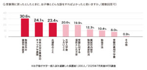 保護者が子どもの受験期に戻れるとしたら、どんな話をしたいかという問いに対しては「勉強以外の雑談や息抜き(30.6%)」「将来(大学卒業後)のキャリアや進路(24.1%)」「志望校のこと(23.4%)」が上位に挙げられる。受験という心身ともに悩むことの多い期間だからこそ、何気ない会話や信頼できる家族への相談が求められていることが分かる。