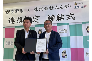 大阪府交野市は、みんがくと連携し、市立学校における「スクールAI」の活用に関する連携協定を10月9日に締結した。スクールAIは英作文や英会話、小論文対策など多彩な学習アプリを教員が手軽に作成できる仕組みを提供するもの。