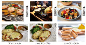 斜めから撮影する画像は「斜俯瞰」と言いボリューム感や立体感が表現できます。真上から撮影する画像は「真俯瞰」と言い、テーブル全体の彩や配置が伝わりおしゃれな雰囲気になります。