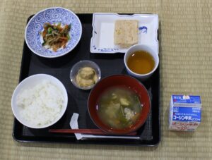 この日の献立は、ごはん・十夜のかしわむし・小松菜のおひたし・湯葉入りすまし汁・お茶だんご・牛乳。すまし汁やおひたしでだしの”うまみ”を味わったほか、きな粉をまぶした「お茶だんご」は、出前授業で大豆や米・お茶を挽いた体験につながる一品。体育館にゴザを敷き、和食器で配膳された特別な給食を児童たちは楽しんだ。