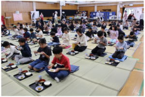 体育館にゴザを敷き、3年生全員で「いただきます」。講師の後藤氏らと共に喫食