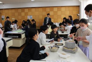 もう一つの授業「すがたを変える食べ物」は、国語の単元「すがたをかえる大豆」に関連づけている。児童は石臼で大豆や米を挽き、粉にするなどを体験。昔の人の手作業の大変さに触れた上で、「なぜわざわざ粉にするのかな」といった問いかけに、児童は「粉にするとおせんべいなど色々なものにできる」「食べにくいものが食べやすくなる」「粉にすると混ぜられる」と自分たちの考えを話していた。