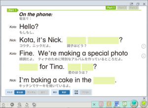 本文は一部を隠した状態で音声を再生できる。新出単語・ランダム・全文から隠す場所を選択できる。和訳も表示できる。