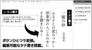 右メニューのボタン1つで「ヨコ書ルビ付」「タテ書ルビ付」に変換。編集もできる