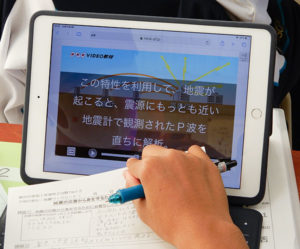 その後、学習者用デジタル教科書の映像を全体で視聴。内藤教諭はポイントを解説。さらに各自の端末で映像を視聴し、緊急地震速報の仕組みや速報の出る判断基準についてわかったこと、疑問点をワークシートの表にまとめた。生徒は、イヤホンを使用せず、字幕機能を利用して視聴。字幕の大きさや配置はそれぞれ異なり、何度も巻き戻して繰り返すなど自分のペースで学習者用デジタル教科書を利用していた。