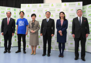 左からベネッセコーポレーション小林仁代表取締役社長、ライフイズテック讃井康智取締役、さいたま市教育委員会細田眞由美教育長、さいたま市スマートスクールプロジェクト鈴木寛アドバイザー、日本マイクロソフト中井陽子執行役員、内田洋行大久保昇代表取締役社長