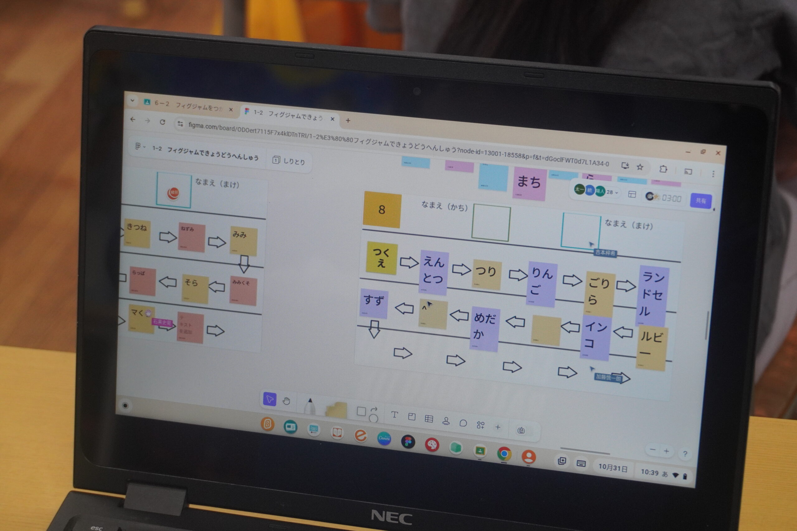 1年「フィグジャムをつかって、きょうどうへんしゅうしよう」では、付箋機能を用いてペアでしりとりを行っていた。