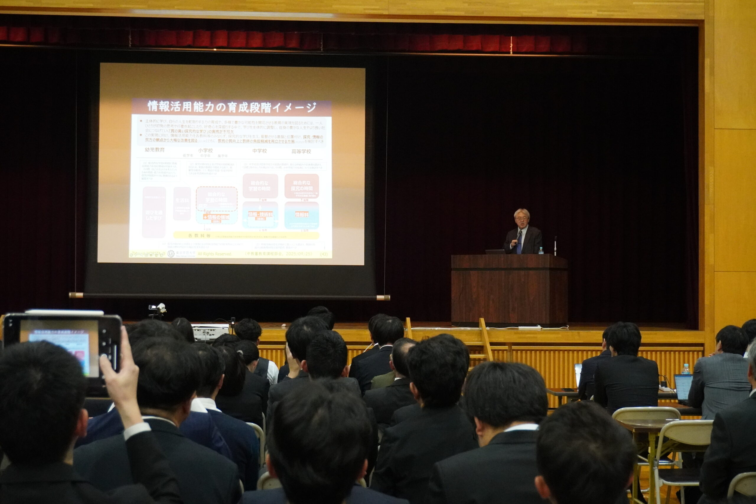 次の学習指導要領では小学校3年から総合的な学習の時間の中に情報の領域が設置される見込み。情報活用能力は他教科への学び方に大きな影響を与える。中学では技術分野に情報を追加して再編される。現在高等学校で行われている情報Ⅰの内容の一部が中学校に降りてくることが予想され、高校の情報の充実と共に小中高等学校を通した情報活用能力の育成が図られる方向で検討中だ。