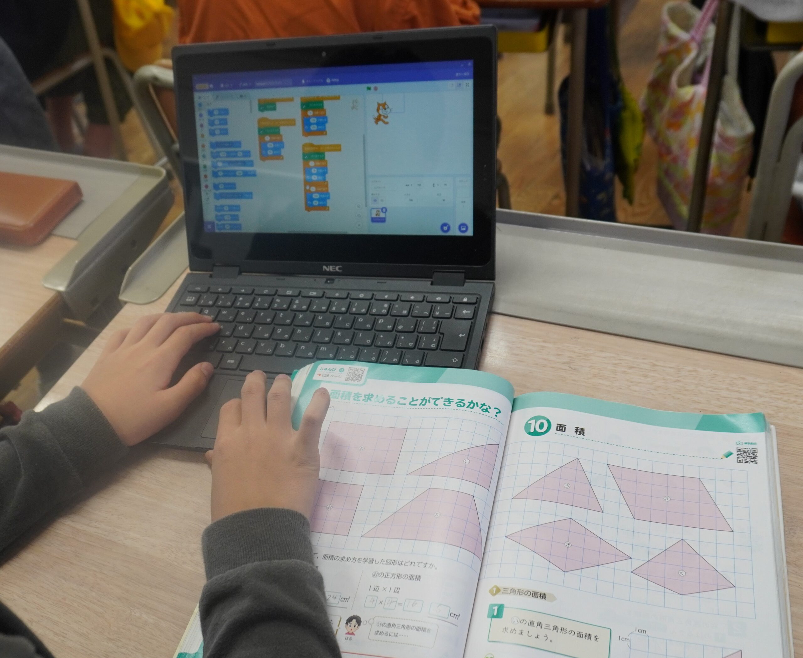 5年「ブロックプログラミングを活用して、図形を描こう」では算数で学んだ四角形のいくつかをプログラミングで描く。できた児童はじゃんけんスクラッチにも挑戦。次のAIレジ制作につなげる。