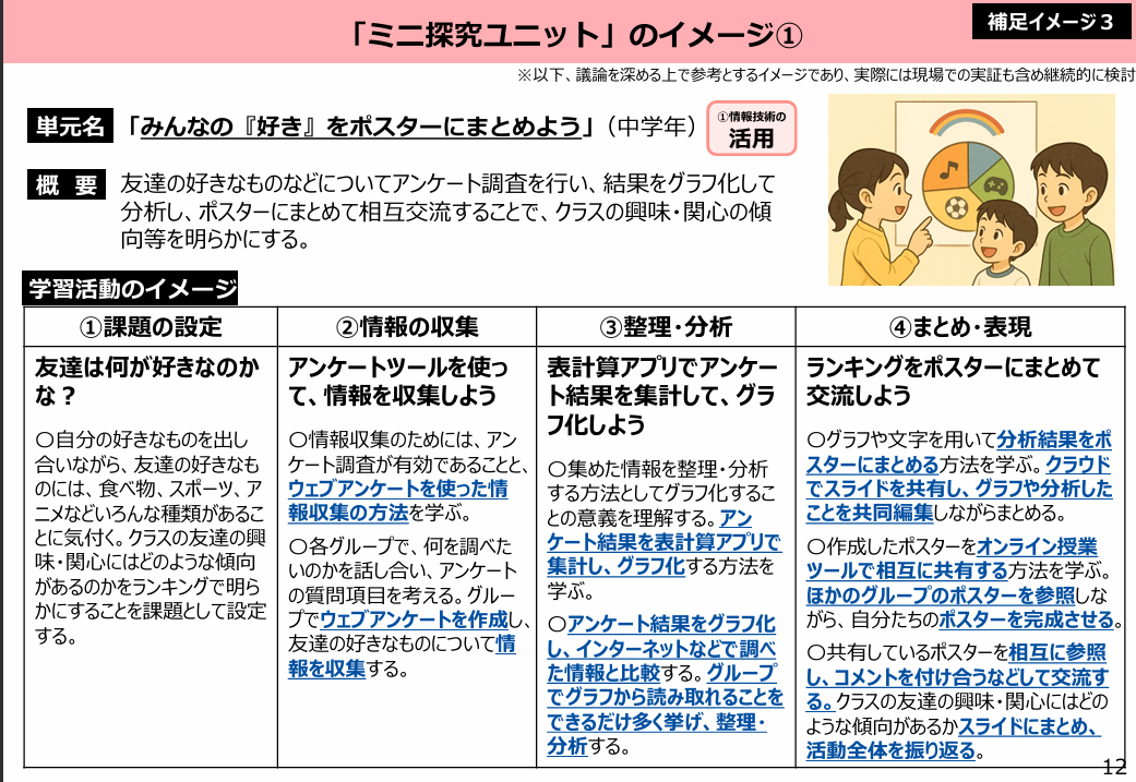 さらにミニ探究ユニットは、情報活用能力を発揮しながら探究のプロセスで活用する体験を『自覚的に』学ぶ小単元であるべき。ミニ探究ユニットや情報ブロックについては各校の実態に応じて方法や順番、教材をそれぞれの学校現場で選択して運用できるようにすることが適当だろう。探究の領域と情報の領域の連携は極めて重要」