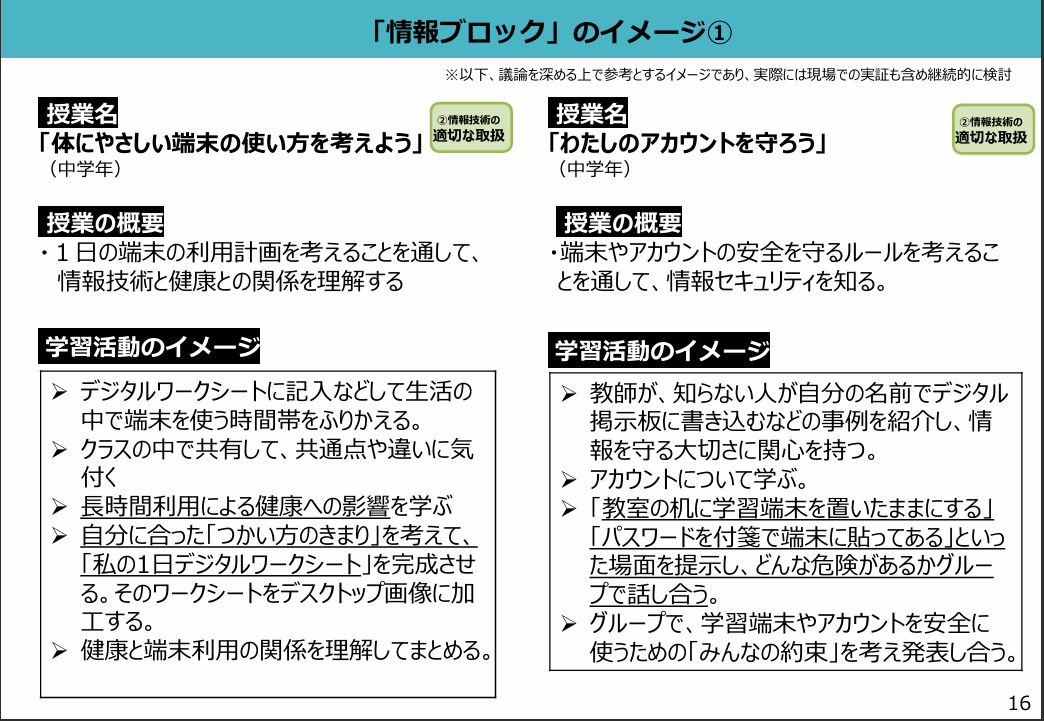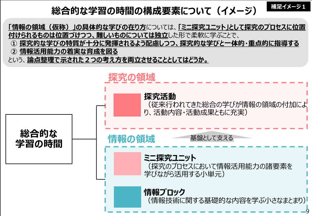 情報の領域については、情報技術に関する基礎的な内容を学ぶ「情報ブロック」と、探究のプロセスにおいて情報活用能力の諸要素を学びながら活用する小単元「ミニ探究ユニット」を設けることを提案。この分類は多くの委員の賛同を得た。