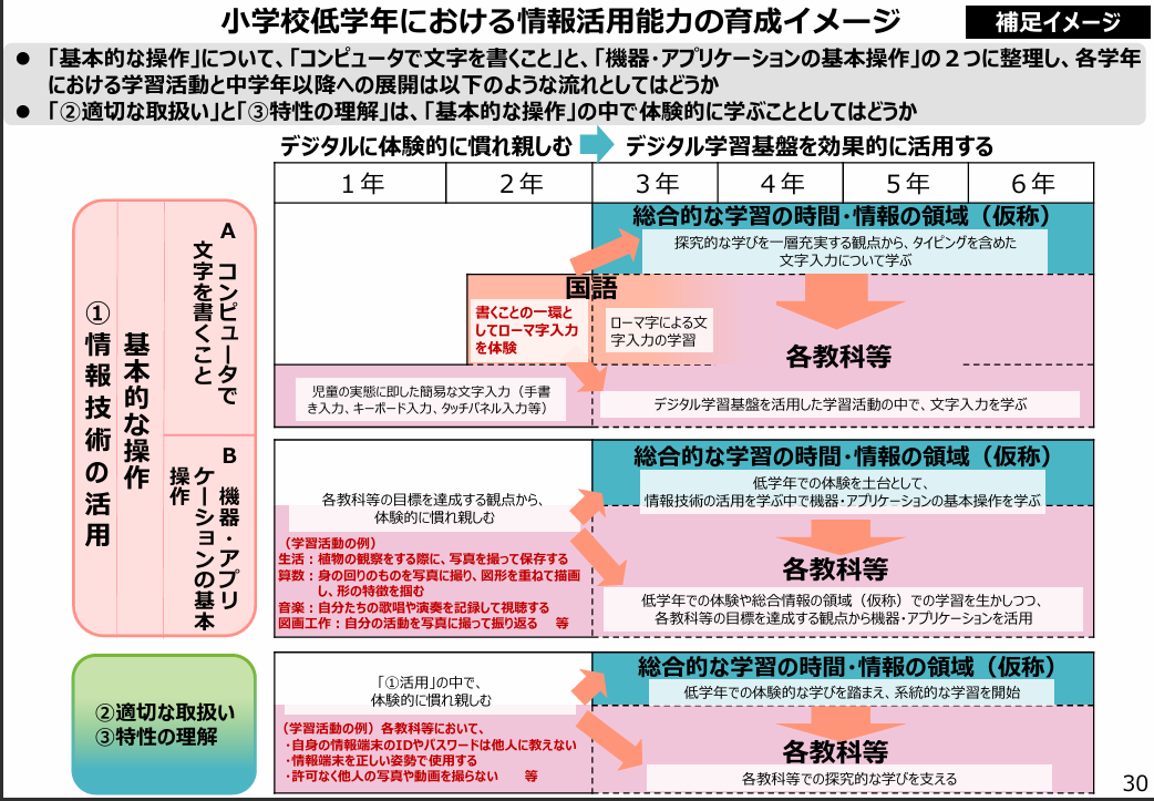 また「機器・アプリケーションの基本操作」について、低学年においては、特に身体性を大切にしながら「写真(動画)を撮る」「録音(録画)する」「動画等を視聴する」「絵を描く」「図形を操作し動かす」など、各教科等での目標を達成する観点からデジタルに慣れ親しむ体験的な活動を行い、3年生以降の総合的な学習の時間に接続する案が出された。