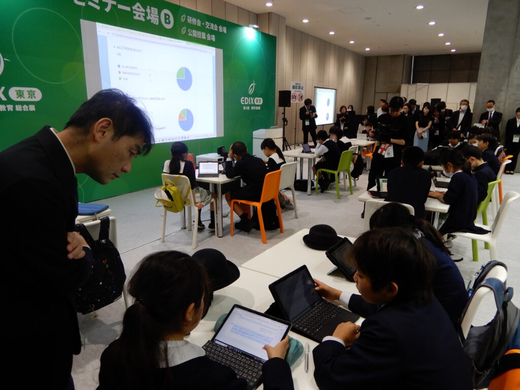 EDIX東京では児童を迎えた公開授業が3本開催された。事務局企画による公開授業はEDIXでは初開催。東京学芸大学附属小金井小学校の鈴木秀樹教諭は、小学校5年国語で、単元「言葉の意味が分かること」を題材に、学習者用デジタル教科書と生成AIを利用した授業を展開している。
