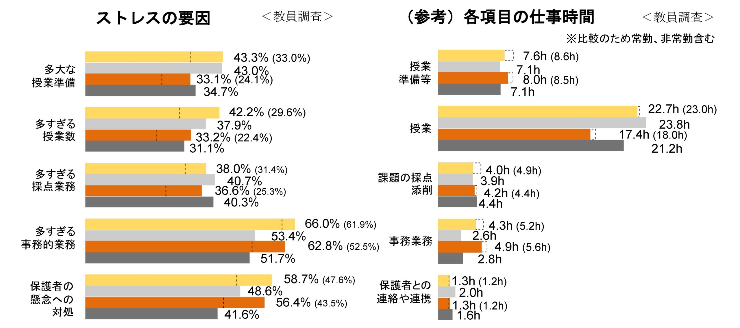 特に事務的業務に対するストレスを感じている教員は小中ともに6割以上であった。なお保護者対応や授業にかける時間は国際平均より短い傾向だ。