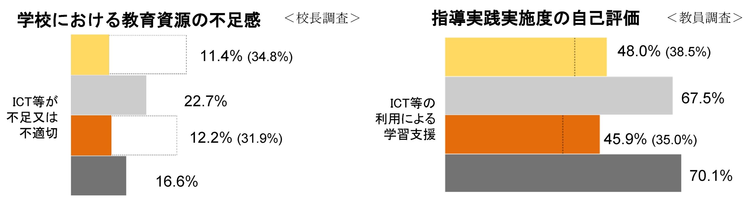また、教員が授業でICTを活用しているという回答は前回調査より小中とも約10ポイント増加したものの(小学校48.0%、中学校45.9%)、国際平均(67.5%/70.1%)には届いていない。