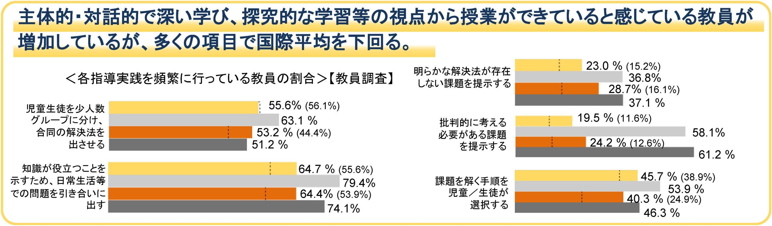 批判的に考える必要がある課題を提示する割合や現在と過去の学習内容の関連を説明する実践の割合、日常生活等での問題を引き合いに出す割合など多くの項目において増加したが、国際平均より低かった。