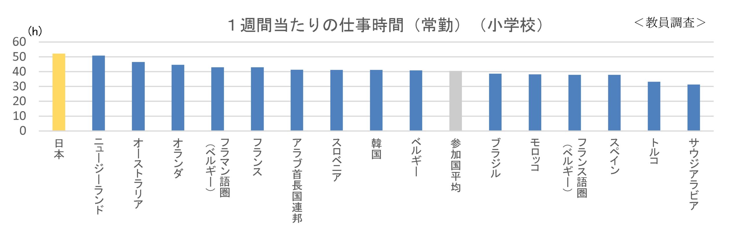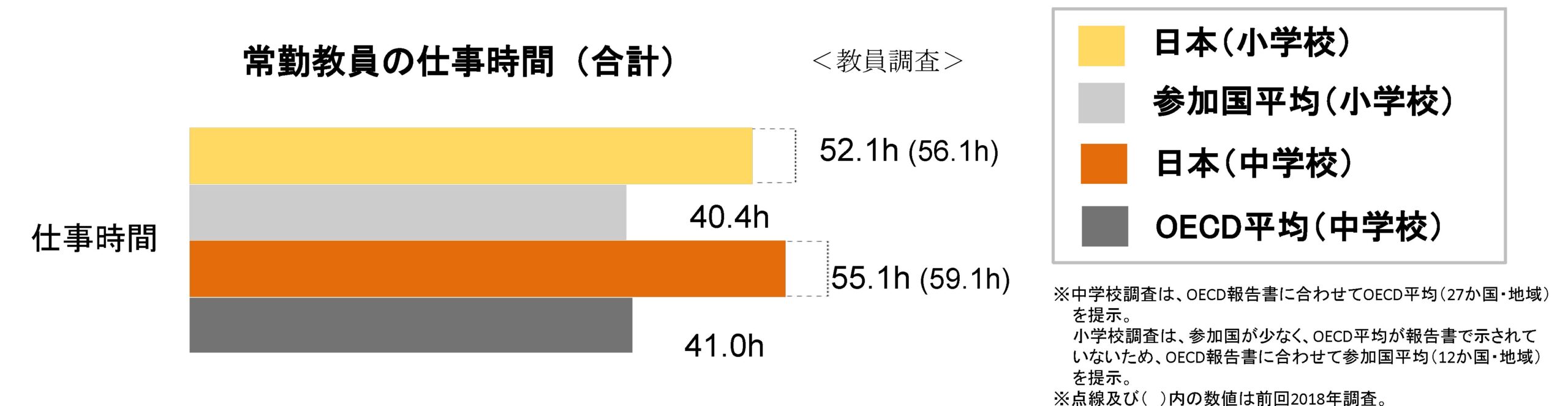 日本の教員の週当たり勤務時間は小学校52.1時間、中学校55.1時間と、前回調査(2018年)より約4時間減少。しかし国際平均(小学校40.4時間、中学校41.0時間)よりも長い。また、授業準備時間や事務業務も減少傾向だが、いずれも国際平均より長い。
