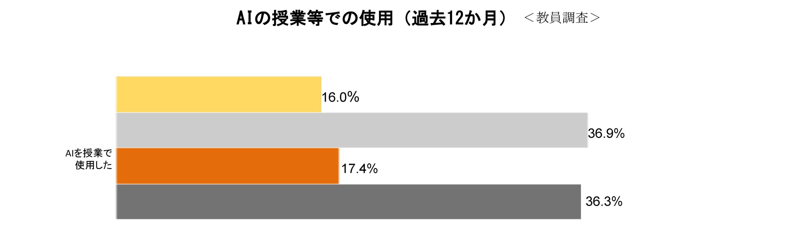 授業等におけるAIの使用状況は、小中ともに16~17%程度と国際平均(36.9%/36.3%)より低い。