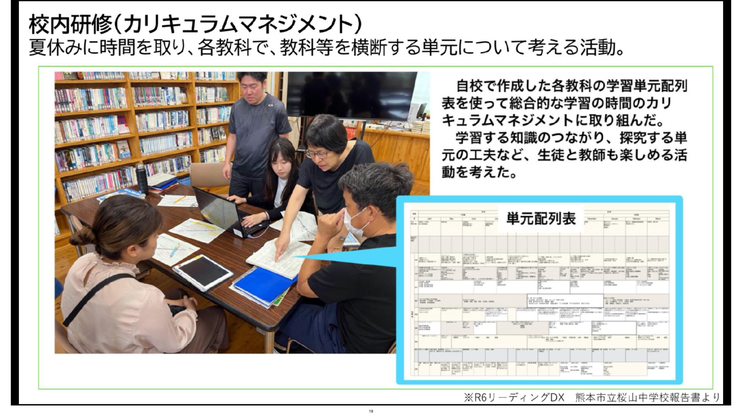 校内研修の改革にも力を入れており、熊本市立桜山中学校では教科等を横断する単元について考える校内研修を実施した。同校で作成した各教科の単元配列表をもとに総合的な学習の時間のカリキュラムマネジメントに取り組み、教科書や配列表から情報を収集してグループで授業アイデアをまとめた。