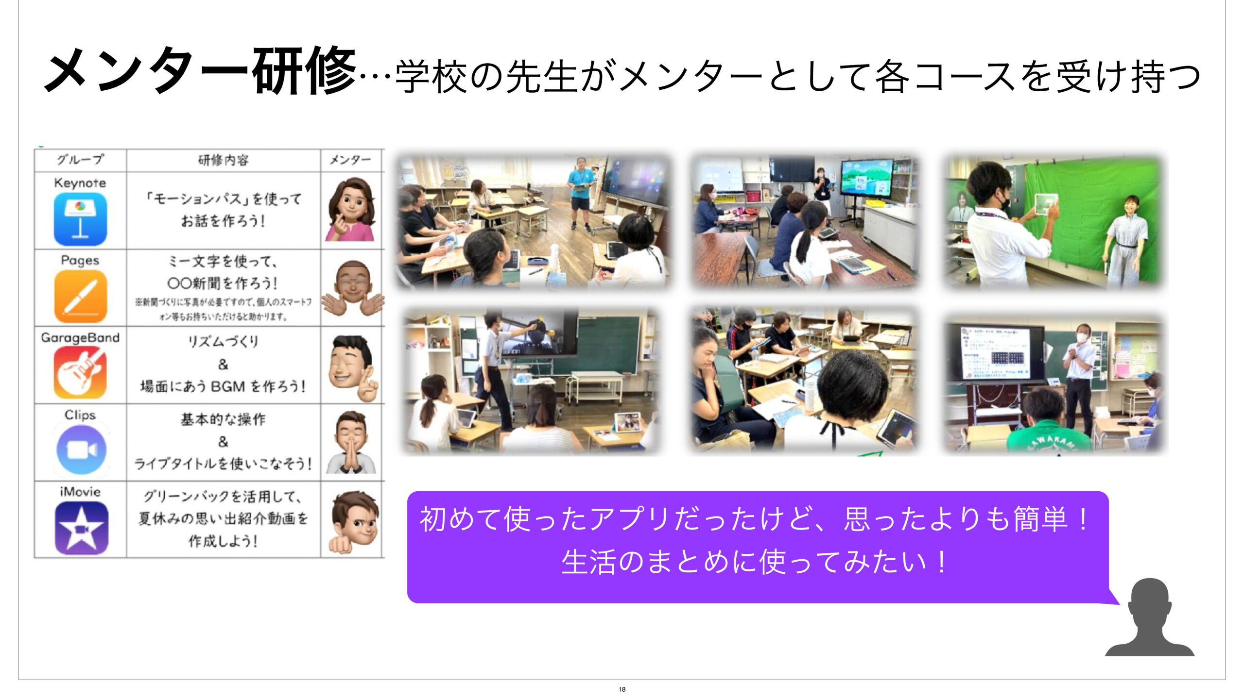 熊本市立川上小学校では5人の教員がGarageBandやKeynoteなど5つのアプリ講座を開設。参加者は2つを選択して体験し、授業での活用方法やアイデアをディスカッション。初めて使うアプリに不安を感じていた教員も「思ったより簡単だった」「楽しく使えた」と前向きな声が多く、授業活用も進んだ。