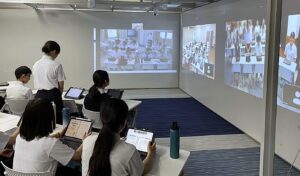 さらに今年度は、ICT教室「未来LAB(Future Class Room)を設置して、新たな学びの環境を構築している。未来LABでは壁一面に広がる大画面マルチスクリーンを設置し、机や椅子が移動できるなどアクティブで多様な学習形態が可能だ。個に応じた学びにも協働的な学びにも適している。本教室は外部とのオンライン通信も可能で、附属中2校(福岡中・久留米中)の生徒会役員との交流でも活用している。高画質なため、同じ空間にいるような臨場感であるということだ。同校で11月6日に実施した研究発表会では、未来LABを利用して美術科の授業を公開した。