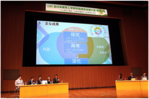 JAET大会1日目のパネル討議は竹園西小学校、みどりの学園義務教育学校、竹園高等学校の教員と各校の伴走講師が登壇した。
