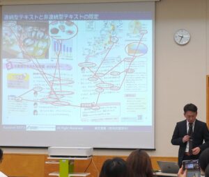 佐藤准教授は教科書を「読解」する力を育むためのワークショップを提案。参加者には社会科の教科書見開きを配布(著作権処理済み)した。