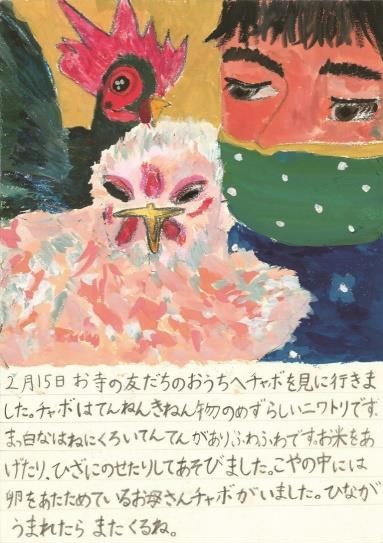 グランプリを受賞した石橋さんは、家族や友達と遊びに行ったようすや友達のお寺で飼育するチャボなどを描いた。特に気に入っているのは「竹のアスレチック」に行った場面を描いた一枚だという。また三菱広報委員会賞を受賞した福永さんは、お節料理など自分に身近な日本の文化や伝統行事を題材にした。「どんと焼き」では炎を描くためにクレヨンを油で溶くなどして工夫した。