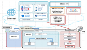 既存のローカルブレイクアウト型の学習系ネットワークに校務系を統合しアクセス制御を前提としたゼロトラスト環境を構築。通信回線は各拠点で2回線利用を基本とする。校務支援システムはパブリッククラウド上で運用し、保護者連絡・デジタル採点等各種システムもフルクラウド化する。